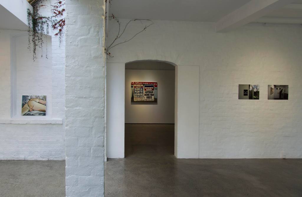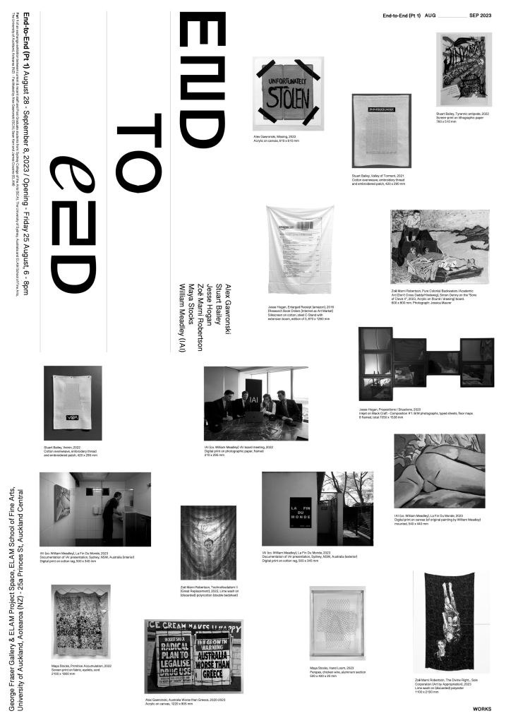 The exhibition’s title suggests multiple parallel readings: the close cultural connections between Australia and Aotearoa (NZ); the Antipodean myth—both countries sharing the notion of being joint ‘ends-of-the-earth’; the role of communication—two tin cups separated by a piece of string, a primitive telephone; end-to-end encryption, the idea of privacy today, constantly under threat; notions of endings—whether the end of capitalism or the end of the world, the latter possibly resulting from climate change or decades of exulting profit over life. Artists within this exhibition address such epochal concepts obliquely—humorously, barely, or not at all.