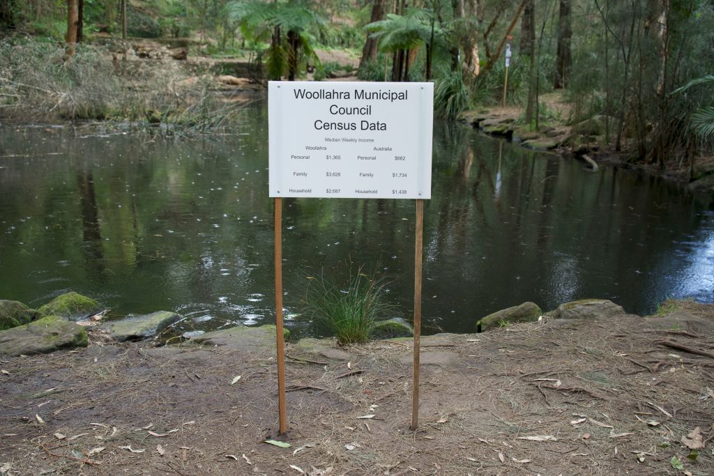 IAI’s Gallery Precinct staged a data-driven intervention in Trumper Park, Paddington—a lush, pond-centered oasis adjacent to Sydney’s dense cluster of commercial galleries. The exhibition featured corflute signs displaying census data for the Woollahra Council area: twice the national average income, 80% white population, and a workforce dominated by banking and finance. Installed along park pathways, these blunt infographics collided with the tranquil setting, framing a question: Who is this art precinct really for?