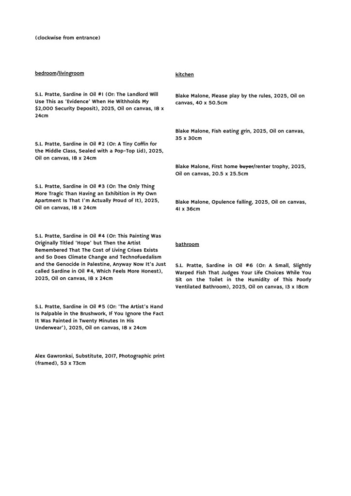 This exhibition takes place entirely within a small, deteriorating studio apartment, which functions as a symbolic space to challenge the infrastructure of the commercial art world. All works are sardine-related, and visitors are invited to eat sardines with bread, creating a situation where participants become part of the installation—literally consuming the object of critique and blurring the boundary between observer and participant. This setup challenges the conventions of traditional exhibitions, emphasising DIY practices and the rejection of institutional authority.
